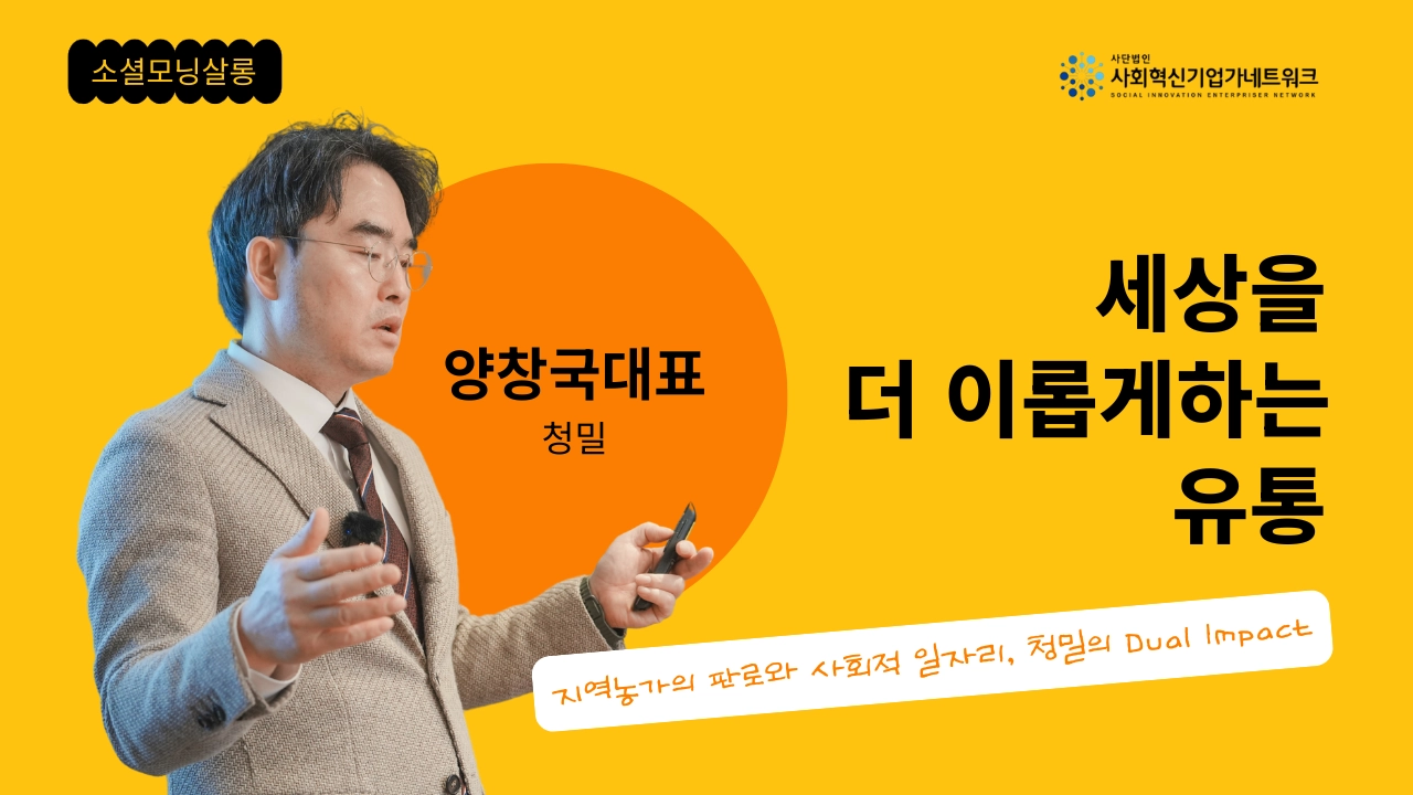 3월의 소셜모닝살롱에서는 청밀 양창국 대표와 함께, 사회적기업이 어떻게 좋은 일자리에서 출발해 고객 맞춤형 유통 솔루션으로 성장하고, 다시 시니어 웰니스라는 새로운 시장으로 확장해 가는지를 살펴보았습니다. 청밀의 흐름은 자립을 돕는 일자리, 고객의 필요를 읽는 큐레이션, 그리고 유통의 경쟁력을 기반으로 한 미래 확장 전략으로 이어졌습니다. 청밀은 식자재 유통을 중심으로 KIT, MRO, 3PL 사업을 운영하고 있으며, 현재 고객사 200곳, 근로자 43명, 취약계층 고용비율 33%의 규모를 갖춘 종합유통회사로 성장해 왔습니다.