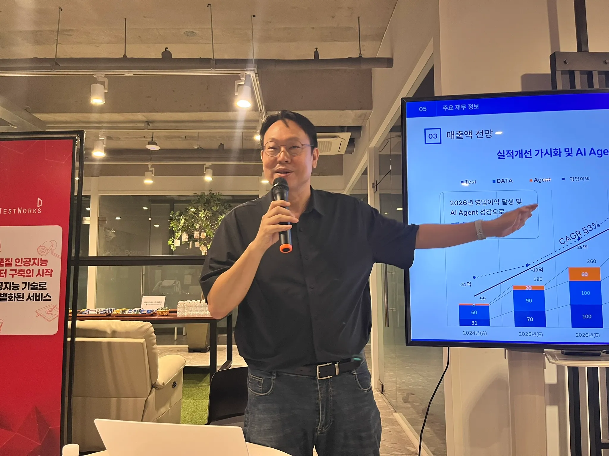 사업 비중은 현재 테스팅·데이터·에이전트가 40:50:10. 향후에는 테스팅·에이전트 솔루션이 핵심 수익 모델로 자리잡도록 전략을 조정하며 운영을 관리하고자 함