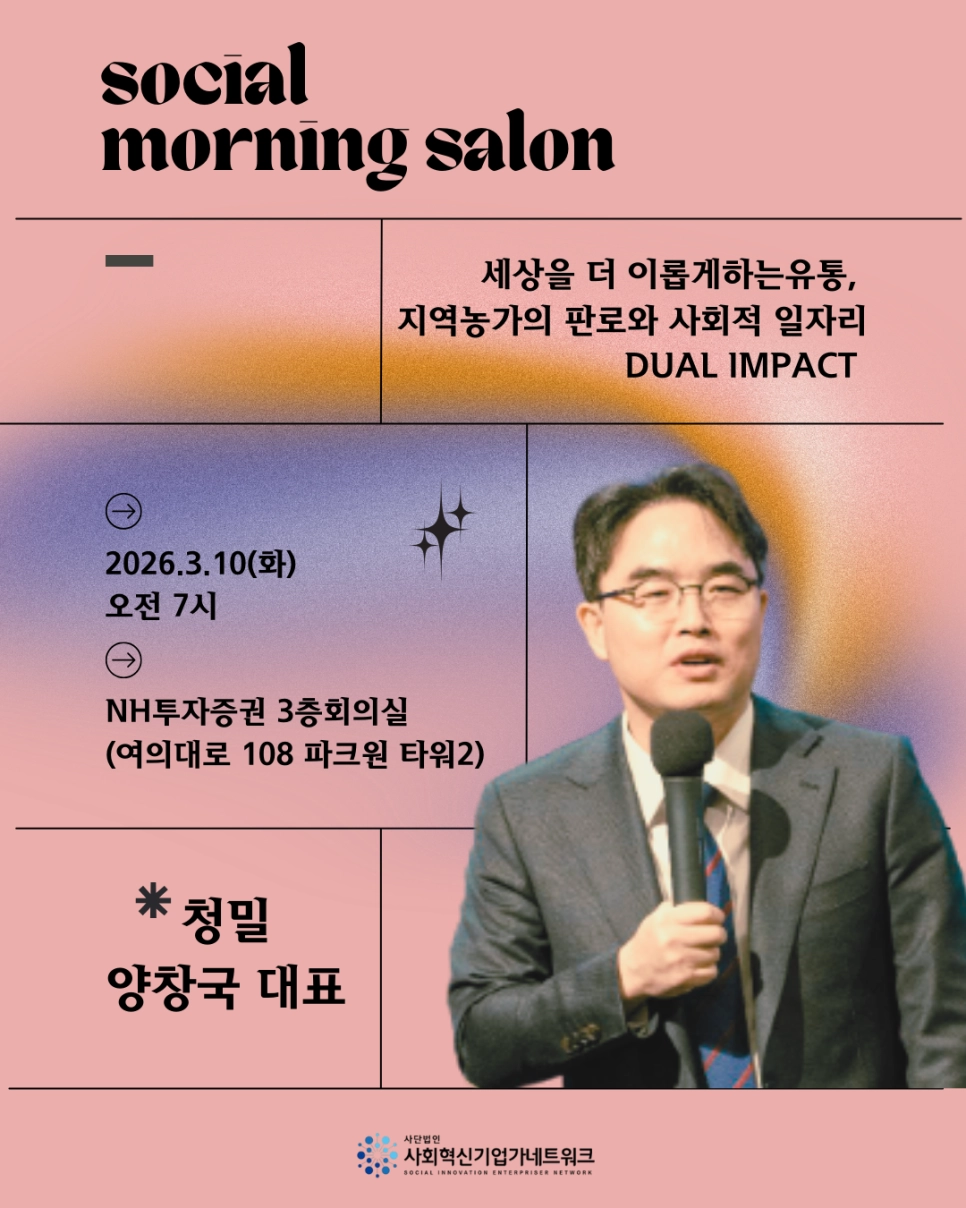 3월의 소셜모닝살롱에서는 청밀 양창국 대표와 함께, 사회적기업이 어떻게 좋은 일자리에서 출발해 고객 맞춤형 유통 솔루션으로 성장하고, 다시 시니어 웰니스라는 새로운 시장으로 확장해 가는지를 살펴보았습니다. 청밀의 흐름은 자립을 돕는 일자리, 고객의 필요를 읽는 큐레이션, 그리고 유통의 경쟁력을 기반으로 한 미래 확장 전략으로 이어졌습니다. 청밀은 식자재 유통을 중심으로 KIT, MRO, 3PL 사업을 운영하고 있으며, 현재 고객사 200곳, 근로자 43명, 취약계층 고용비율 33%의 규모를 갖춘 종합유통회사로 성장해 왔습니다.